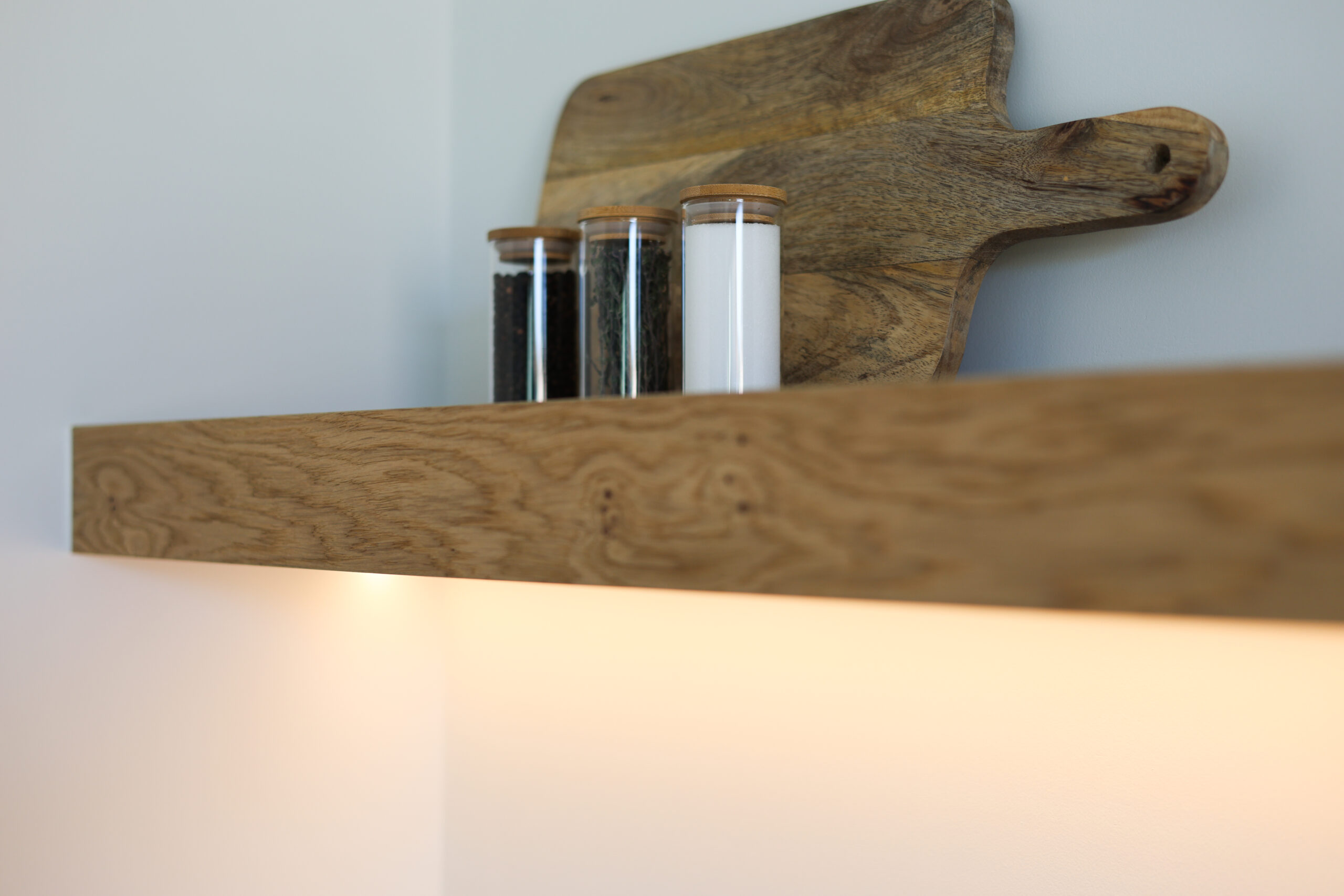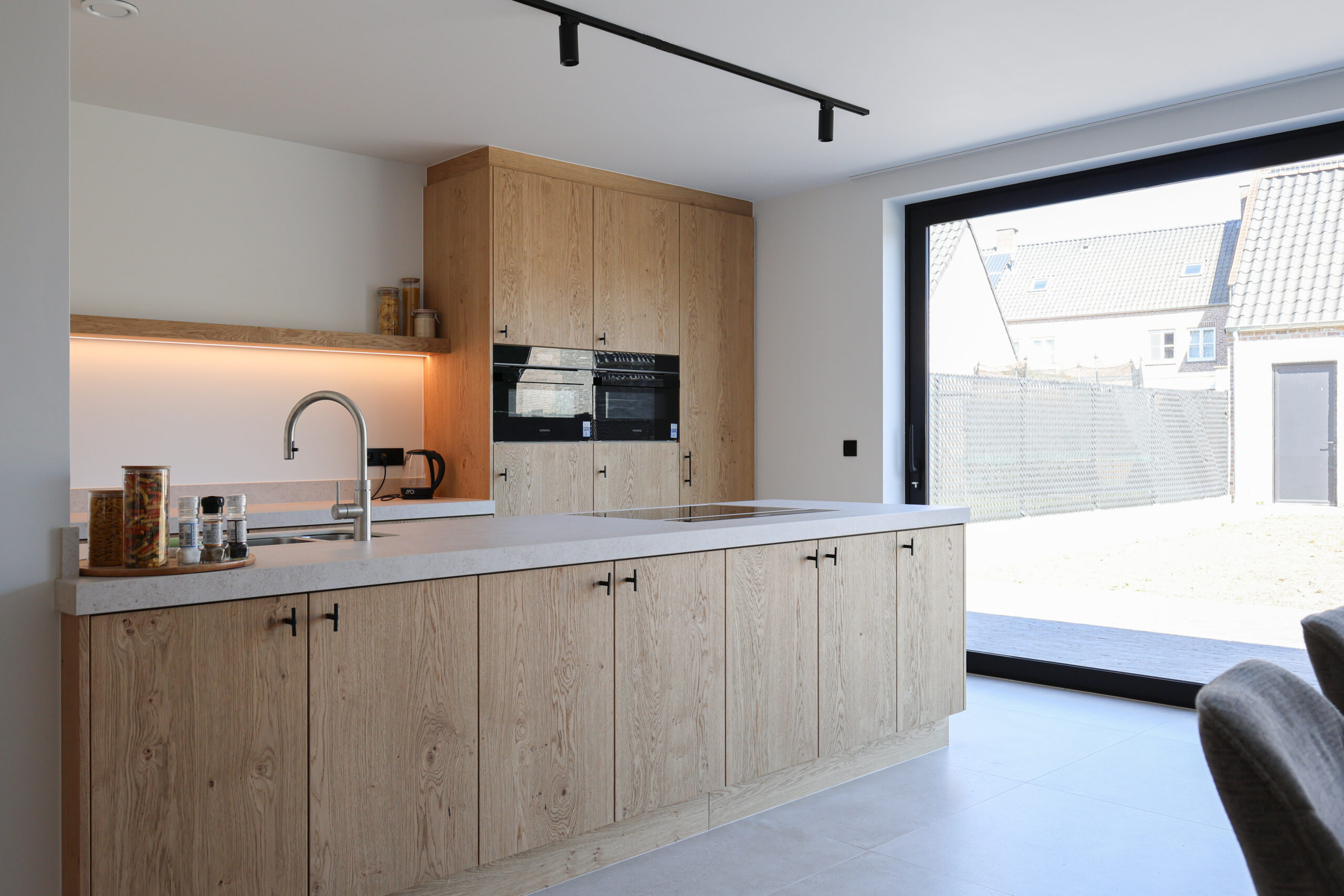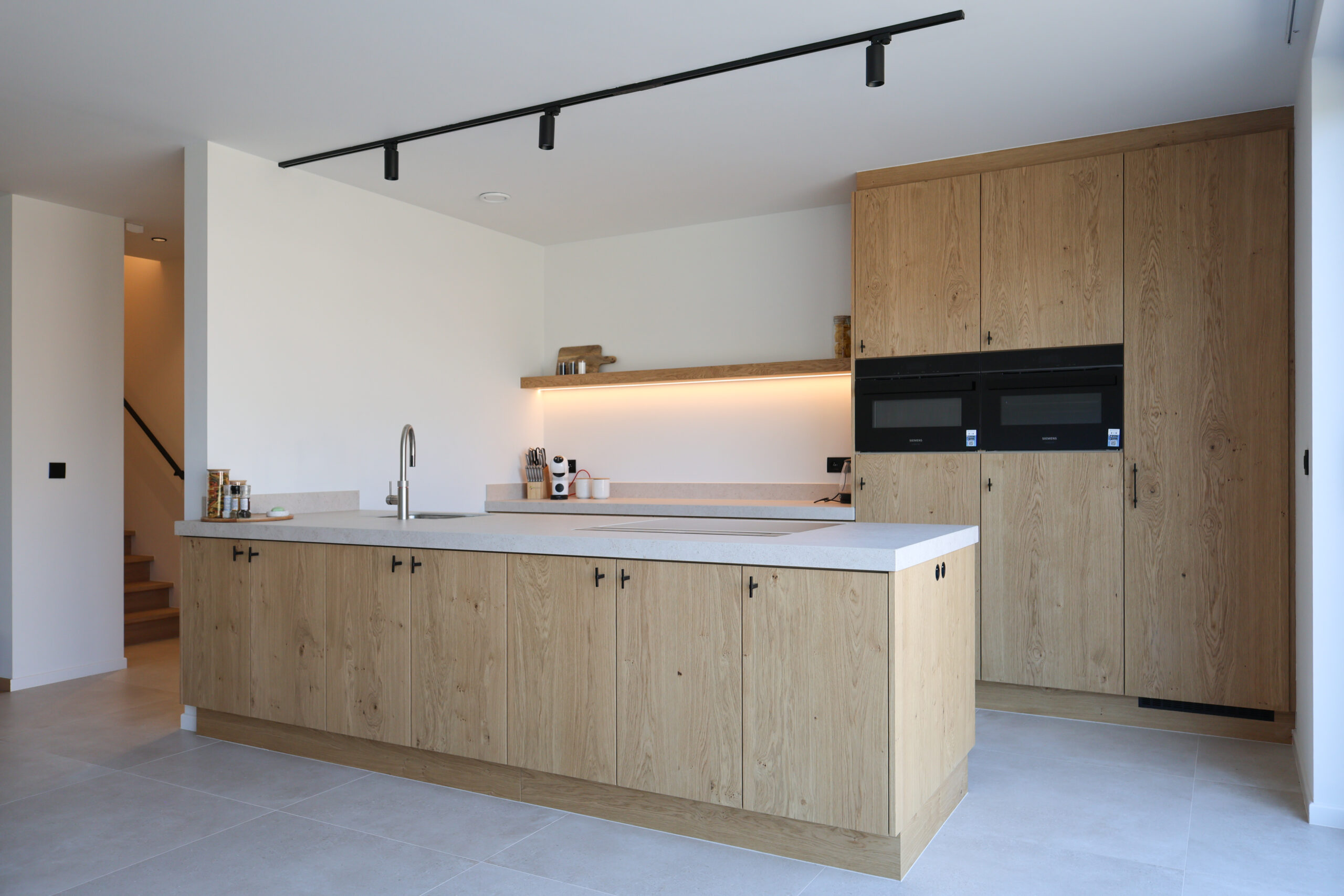 Strakke lijnen, warme materialen en pure functionaliteit komt samen in deze tijdloze modern-landelijke keuken. Voor dit project kozen we voor een combinatie van eiken fineer met een licht beige keramieken werkblad, wat zorgt voor een warme natuurlijke uitstraling dat is afgewerkt met zwarte accenten wat het een landelijke toets geeft.